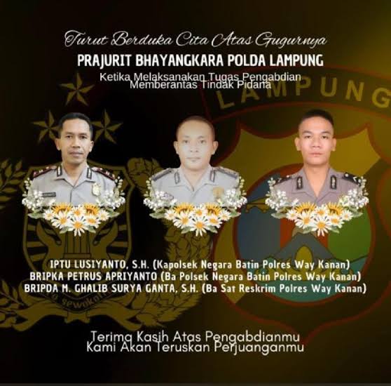 Lampung, Nitikan.id – Pada Senin, 17 Maret 2025, tiga anggota Polres Way Kanan, Lampung, gugur saat melakukan penggerebekan judi sabung ayam di Kampung Karang Manik, Kecamatan Negara Batin. Ketiga anggota yang gugur adalah Kapolsek Negara Batin IPTU Lusiyanto, Bripka Petrus, dan Bripda Ghalib. Mereka mengalami luka tembak di bagian kepala yang dilakukan oleh orang tak dikenal.